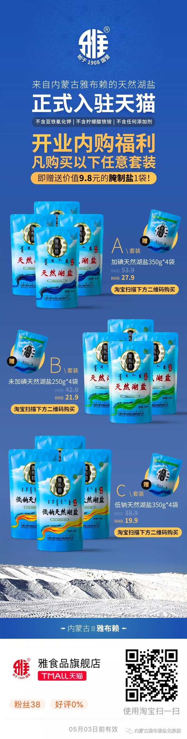 电商公司通过京东的层层严格审核,雅盐天猫旗舰店于4月1日隆重开业。自此,雅盐食用盐、洗涤盐系列8个单品全部上线销售,分别为:大青盐(320g)、低钠天然湖盐(350g)、未加碘天然湖盐(250g)、天然湖盐(350g)、腌制盐(400g)、精制盐(400g、2500g)、果蔬洗涤盐(320g)。 现在,消费者只需在淘宝输入“雅布赖盐”、“雅食品旗舰店”或使用淘宝扫描上图二维码,即可找到由庄闲网站官网版-登录入口