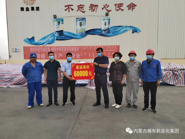 酷暑送清凉,慰问到一线。74日上午,盟人大工委党组成员、副主任、盟工会主席毕克在旗委副书记王东、旗总工会主席娜佈琪的陪同下到雅盐化集团公司开展“夏送清凉”慰问活动,为公司全体员工送上6万元防暑降温慰问金。公司党委书记、董事长李奎锦,工会主席张菊萍等相关领导接待。